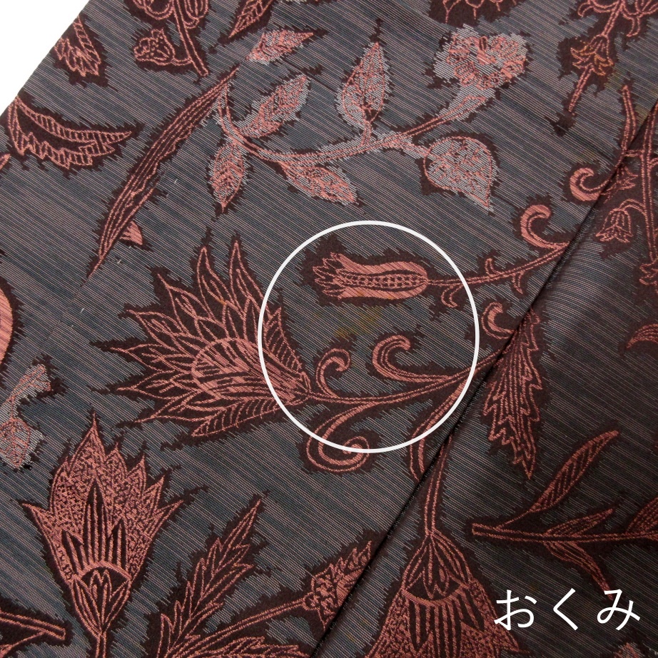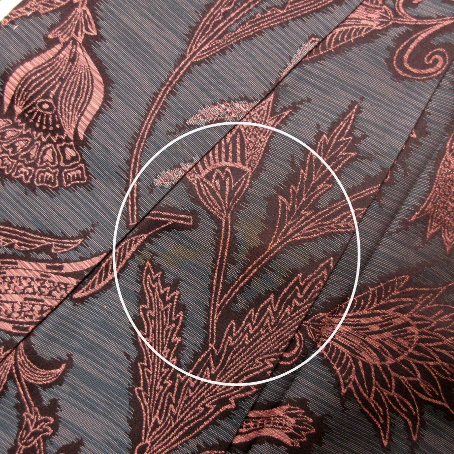 ■雅星■レトロ!!ネイビーグラデ*唐花♪お召し 正絹袷 裄62丈150 販売価格 17,800円 (税込) 購入数 \送料無料/ カートに入れる この商品について問い合わせる お気に入り 特定商取引法に基づく表記 商品詳細 状態ランク: ★★★ シボのない、しなやかな手触りのお召し地。 グラデーションのネイビーベースに唐花が織り出されたシックなデザイン。 ポップな色柄が苦手な大人の女性にもおススメ! レトロ初心者さんにもおススメしたいお召しキモノです。 《袷・広衿》身長〜155cm位までの方にオススメです。 胴裏が変色しています。 所々に画像の様なシミがありますが、地に紛れています。 ひどく濃い箇所はありませんのでお気軽にお楽しみ頂けます。 着物のみの価格で、帯・小物は含まれておりません。 サイズ・素材 裄 62cm 肩身丈 150cm 袖丈 50.5cm 袖幅 32cm 前幅 23cm 後ろ幅 28cm 内揚げ 0cm 縫込み(袖側) 2cm 縫込み(肩側) 2cm 素材 正絹 状態ランクについて ★★★★★ 超美品・新品・未使用品です。 ★★★★ 中古品ですがダメージの無いお品です。 ★★★ 薄ジミなどがありますが着用時には目立ちません。 ★★ 工夫次第で十分着用可能なお買い得品です ★ 大きめのシミがありますので、リメイク材料等にどうぞ。 _an