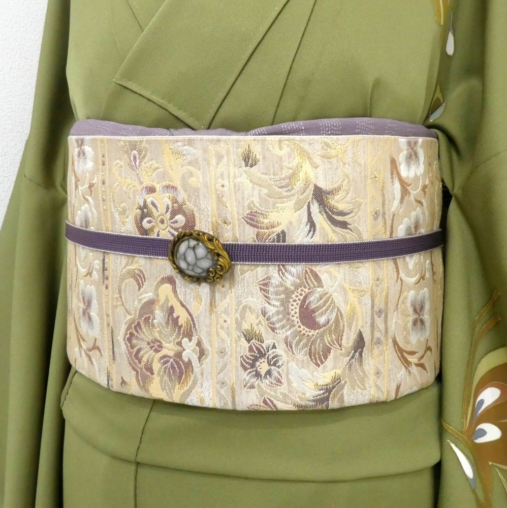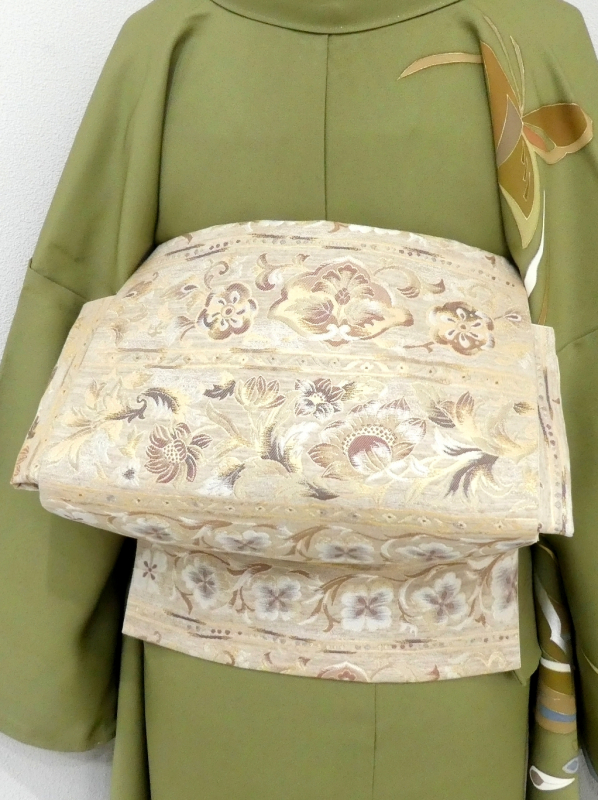 優しいベージュ系であしらわれた唐花模様が横段状にデザインされています。