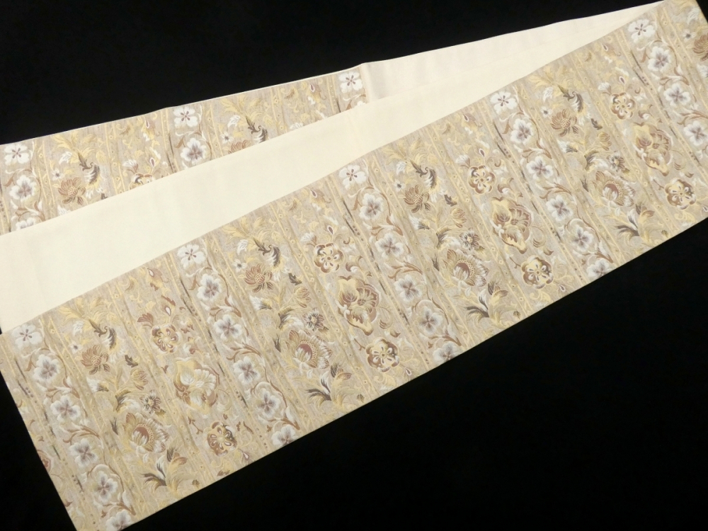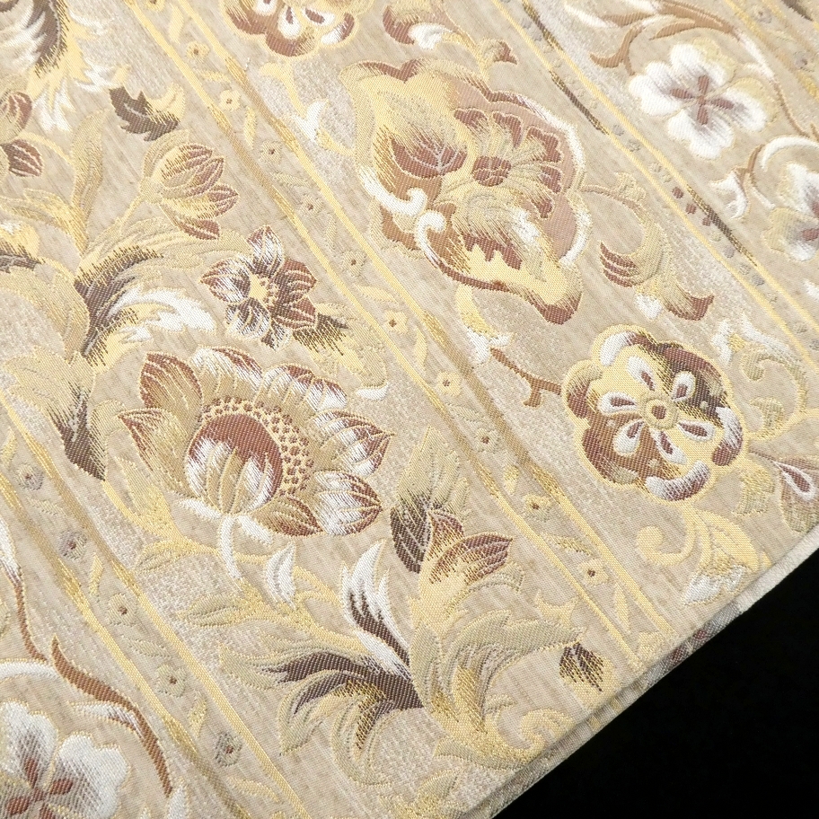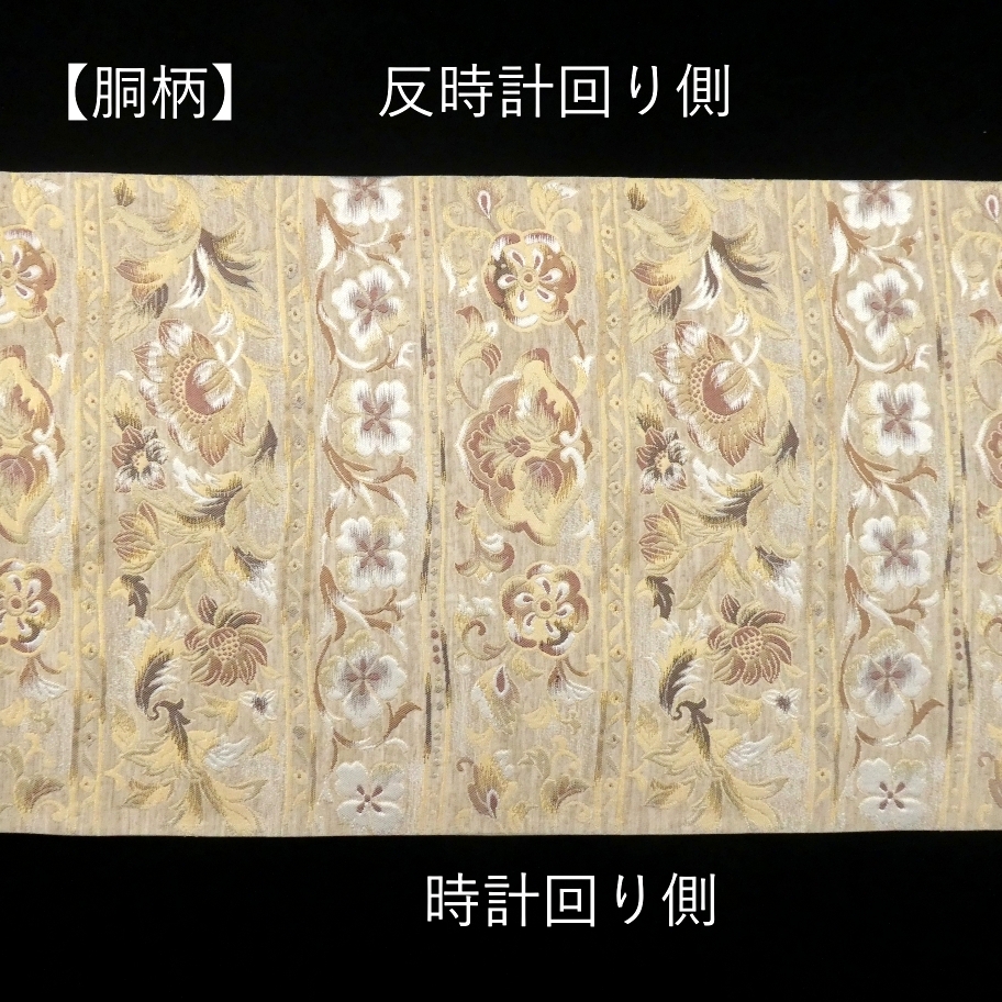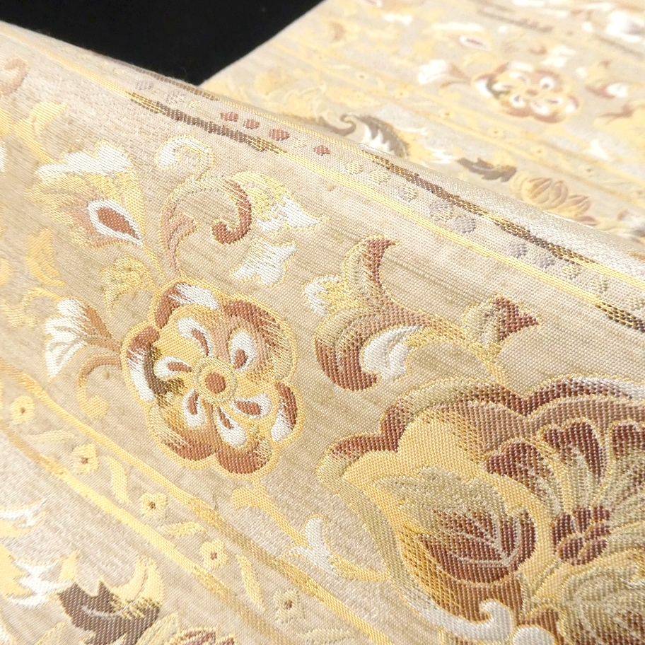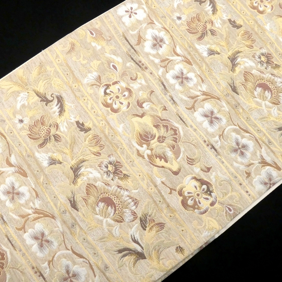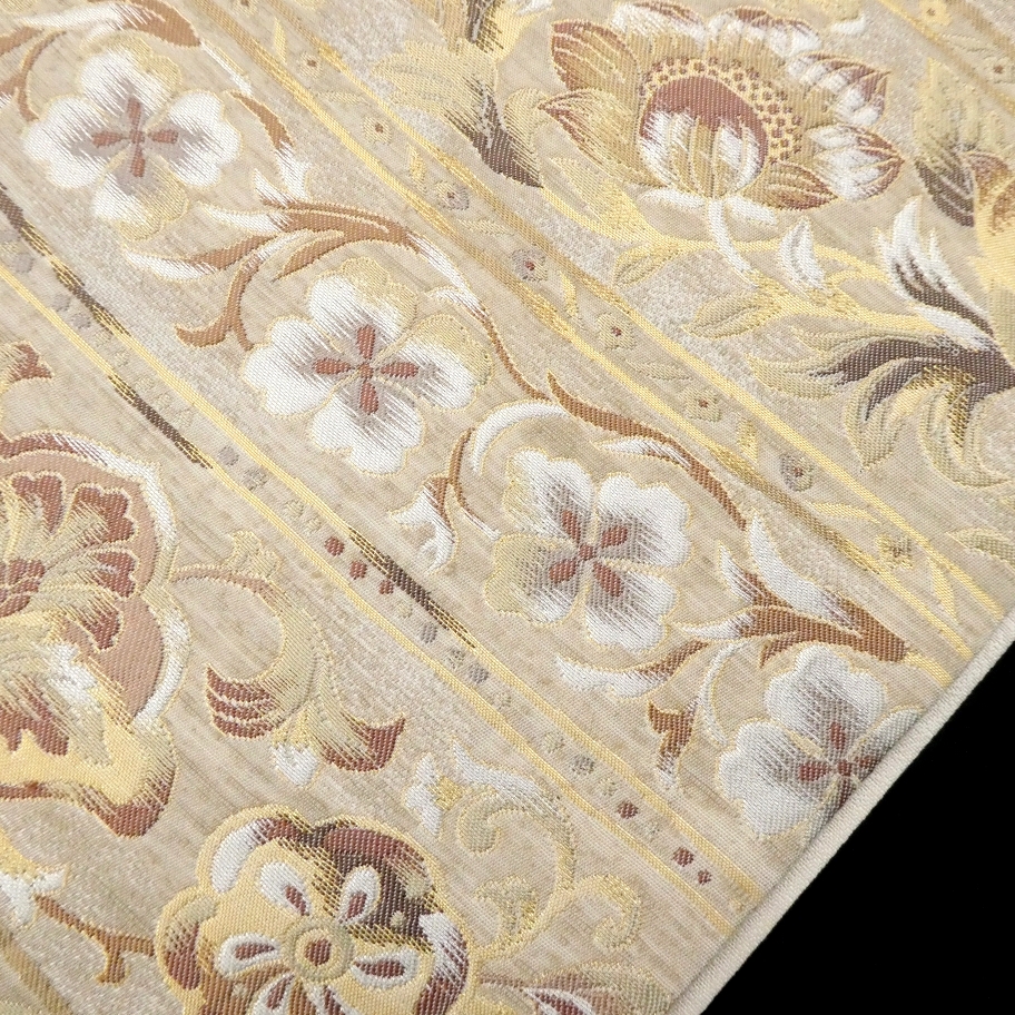 〓雅星〓未使用超美!!ベージュ*横段 唐花模様♪正絹六通《袋帯》