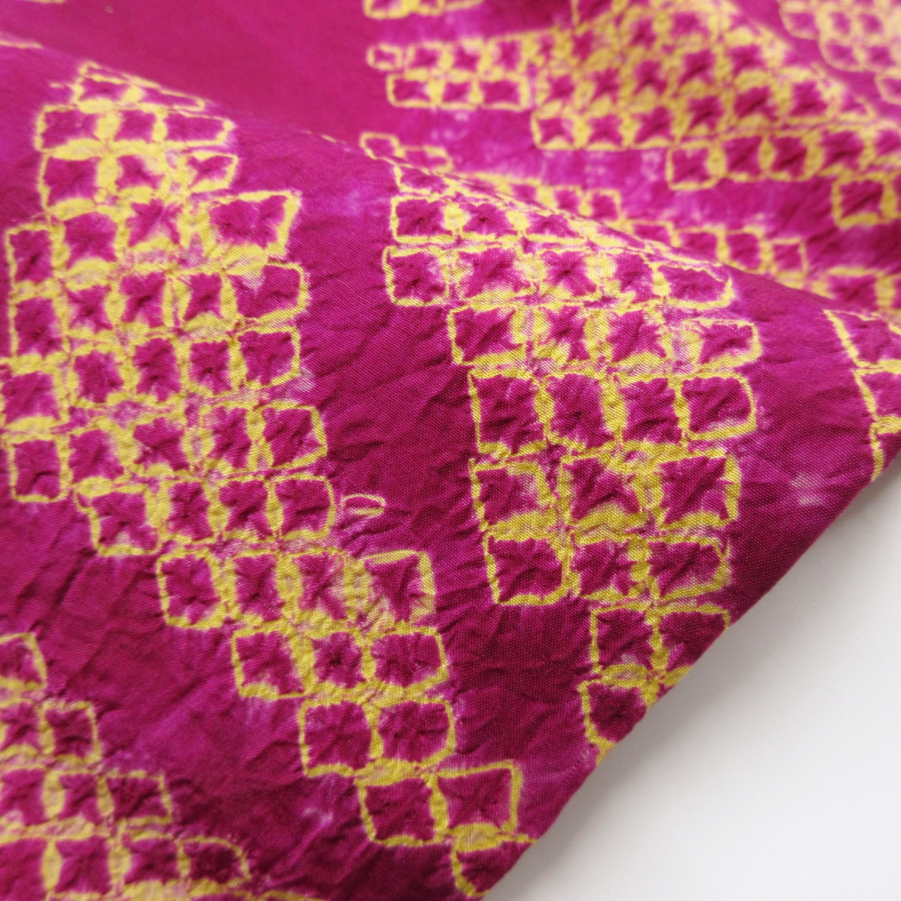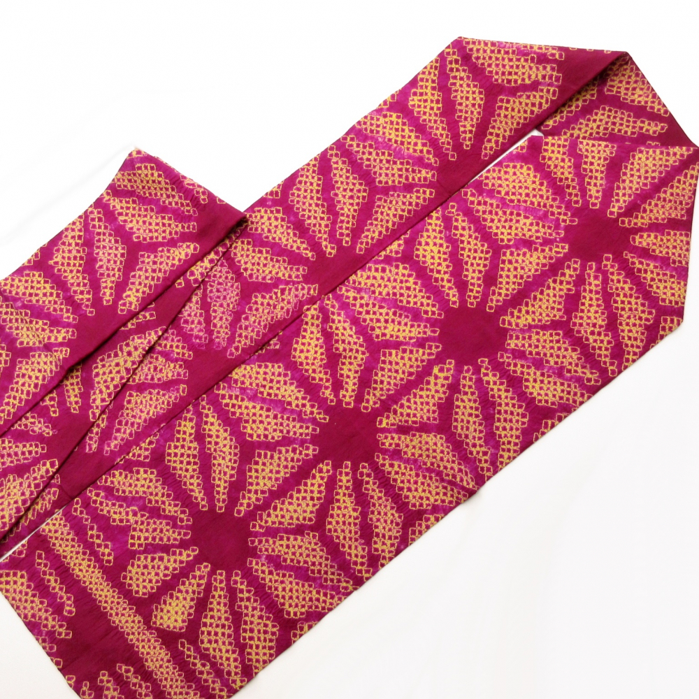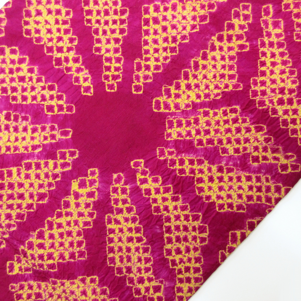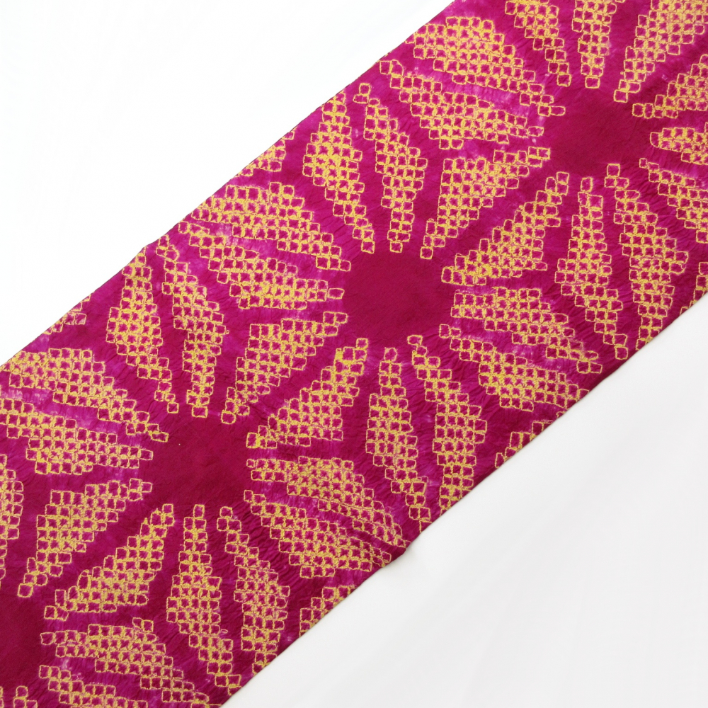 ビビットなベリー系ベースに大きな麻の葉文が絞りでデザインされています。