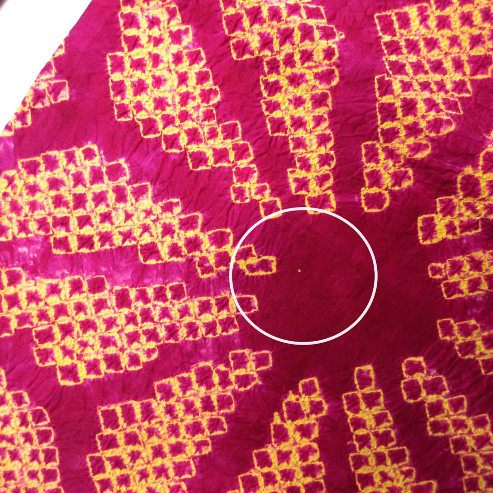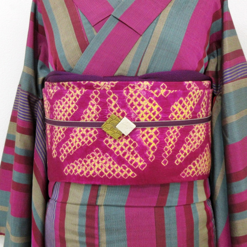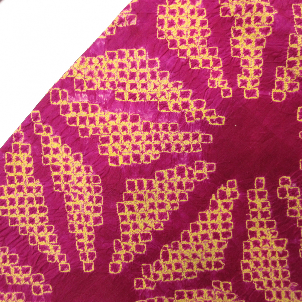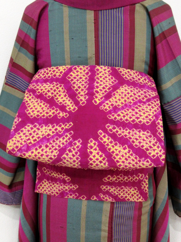 ビビットなベリー系ベースに大きな麻の葉文が絞りでデザインされています。