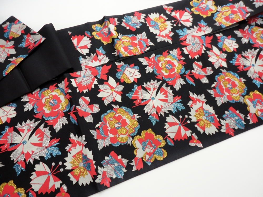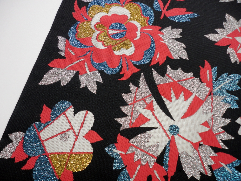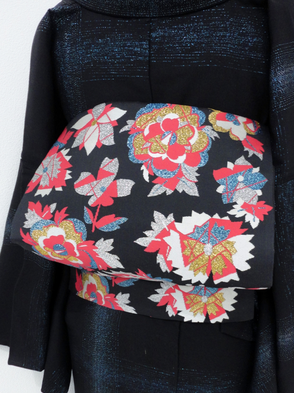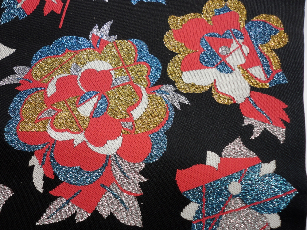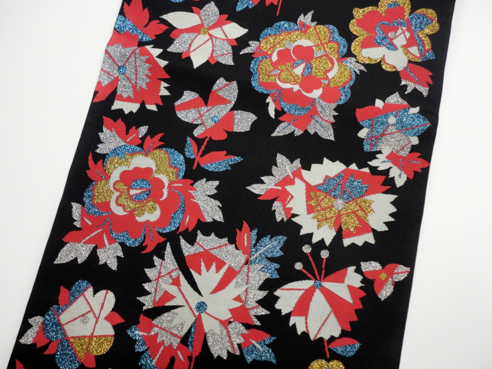 ブラックベースに金銀糸の煌めく花模様が華やかで目を惹きます◎