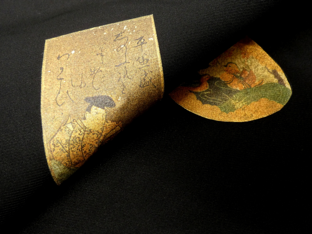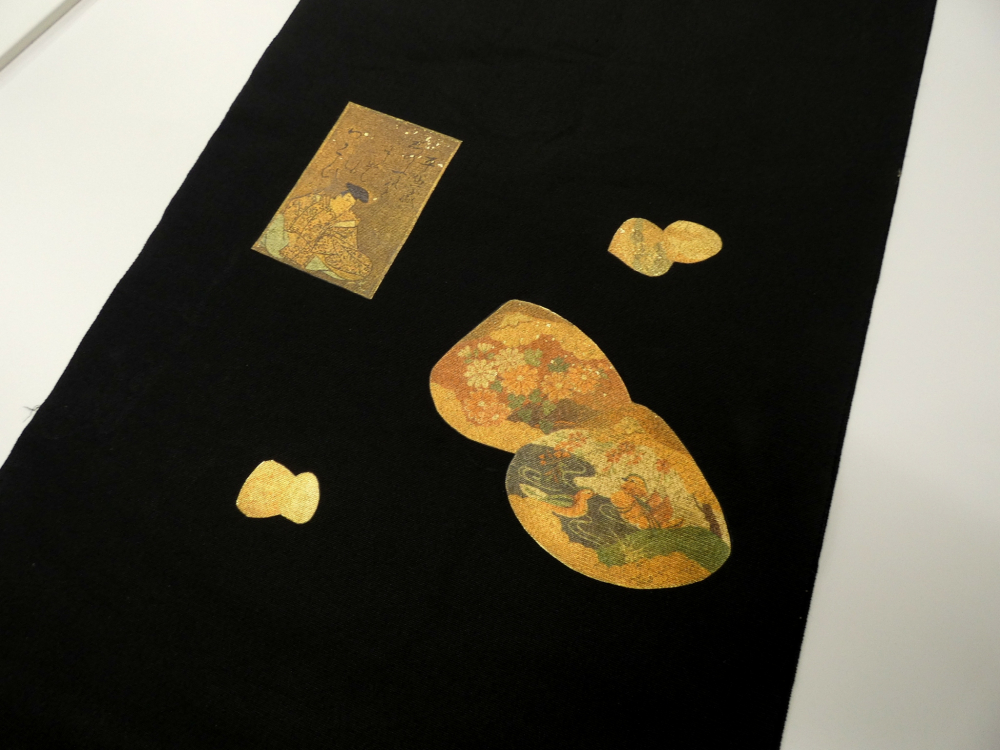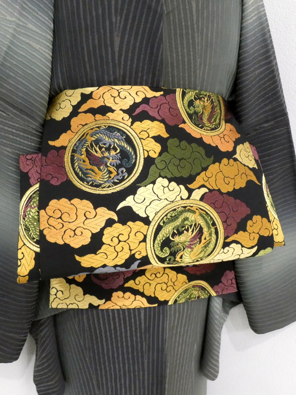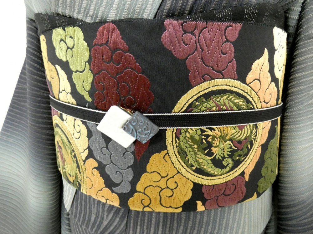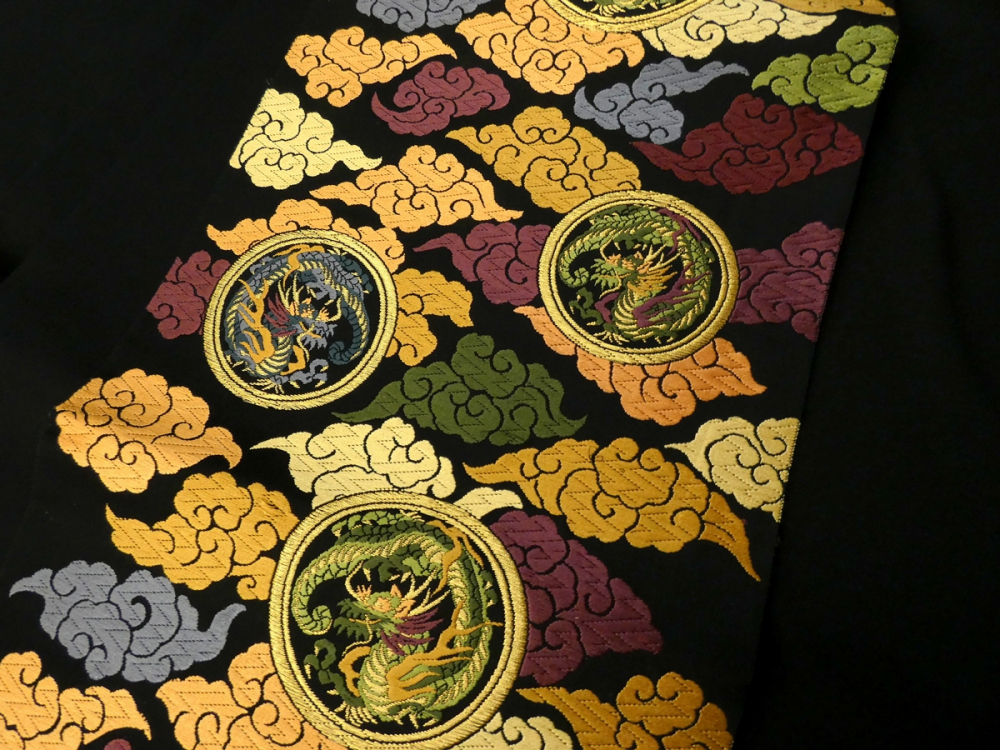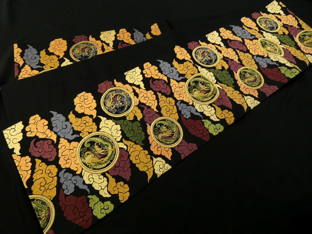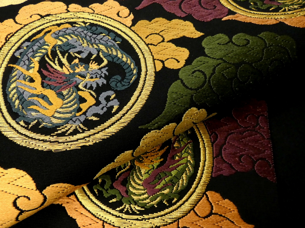 ブラックベース、カラフルな唐織で瑞雲と龍丸文が織り出されています。